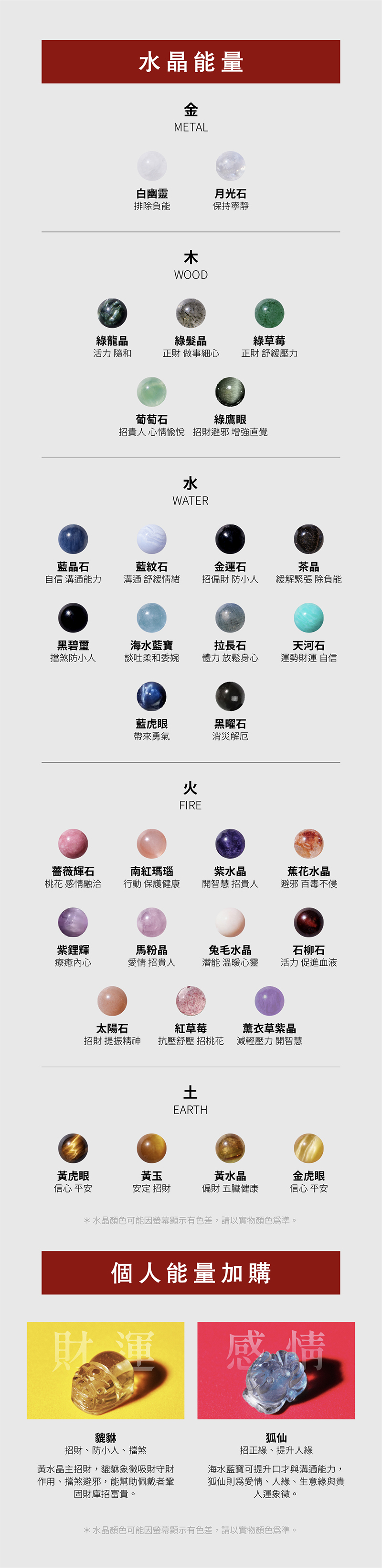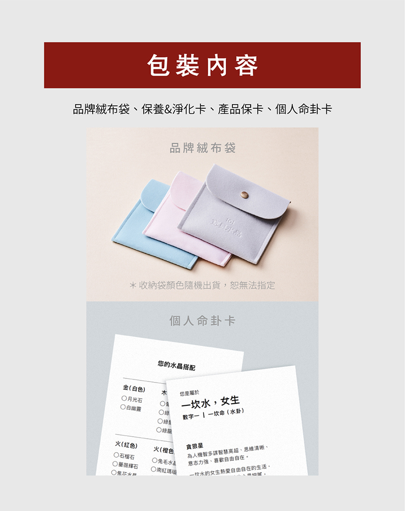 水晶為天然材質,加上手工製作特性,實際完成品可能與照片略有不同。不同螢幕裝置也可能造成顏色顯示差異,請以實品為準。