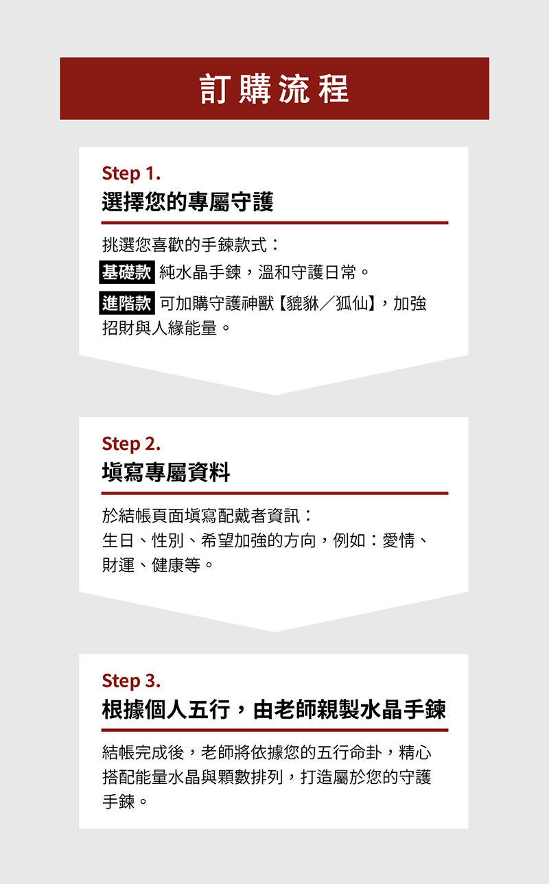 我們依據你的生日、生肖與性別,計算個人五行屬性,搭配合適的水晶種類、色系與顆數,進行專屬排列。