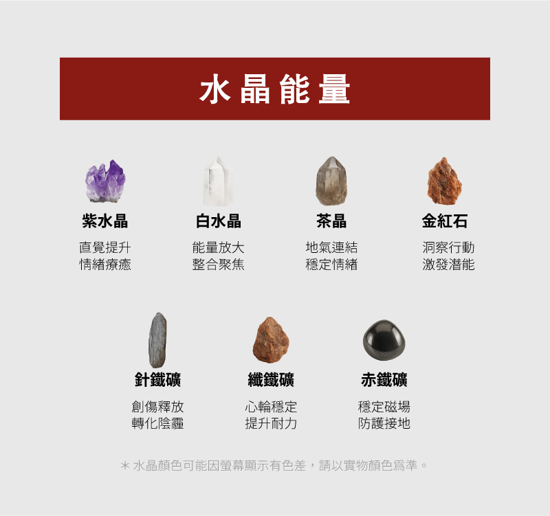 水晶為天然材質,加上手工製作特性,實際完成品可能與照片略有不同。不同螢幕裝置也可能造成顏色顯示差異,請以實品為準。